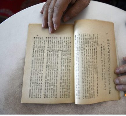 “这件政策汇编在中华人民共和国成立前,由中共中央中原局以党内文件(共44篇)方式发至县团级以上的党政军干部学习运用,是当时干部必读文件,说明并证明我们的党在战争年间与人民群众的鱼水之情。”金老师认真地向来客介绍手中的书刊,并展示了其中《习仲勋同志关于新区工作问题给毛主席的报告》等珍贵史料。金老师表示,今天在拿出来阅读倍感亲切!