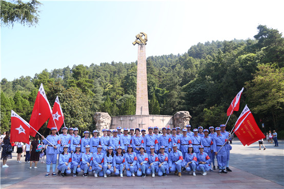 在红军山烈士纪念碑前,全体学员庄严肃立,默哀致敬,面对鲜红党旗,重温入党誓词。