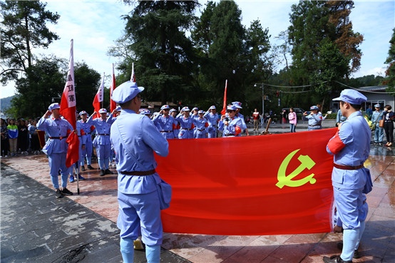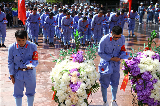 全体学员在红军烈士纪念碑前,面对党旗,紧握右拳,用铿锵有力的声音重温入党誓词。