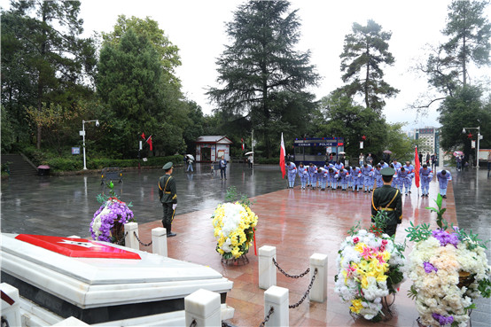 开班仪式结束后,学员们来到红军山烈士陵园,这里埋葬着建国后在遵义各处找到的红军遗骨。整个陵园青松翠柏,一座巨大的红砂石墓茔掩映在万绿丛中,里面安葬着红三军团参谋长邓平同志的骨灰。