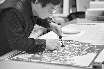 为纪念遵义会议召开82周年,贵州省遵义市民间艺术家刘志华创作完成了剪纸作品《遵义会议》。该作品长1.5米,宽0.66米,作品中参会人物神态各异,栩栩如生,生动再现了1935年1月15日至17日中共中央在遵义召开政治局扩大会议时的情景。图为,3月26日刘志华在做作品的收尾工作。